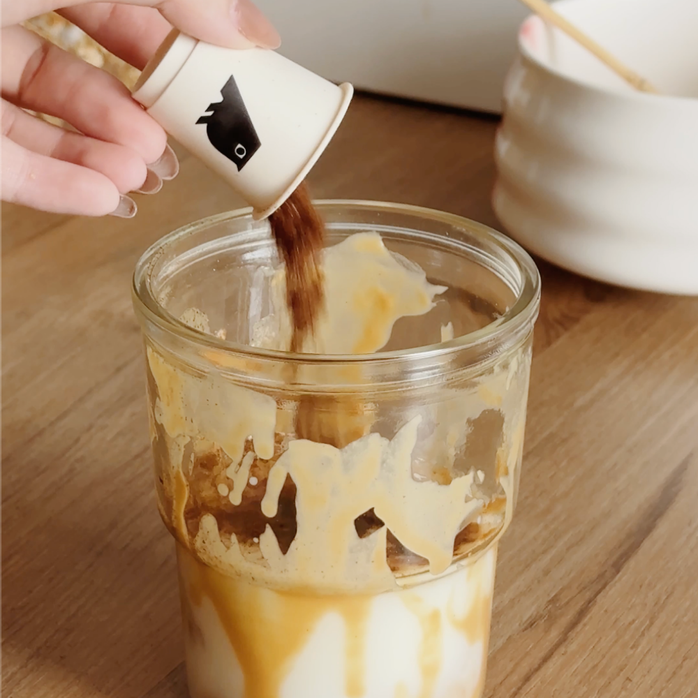 - Begin by preparing 160-200ml of hot or cold milk/water.